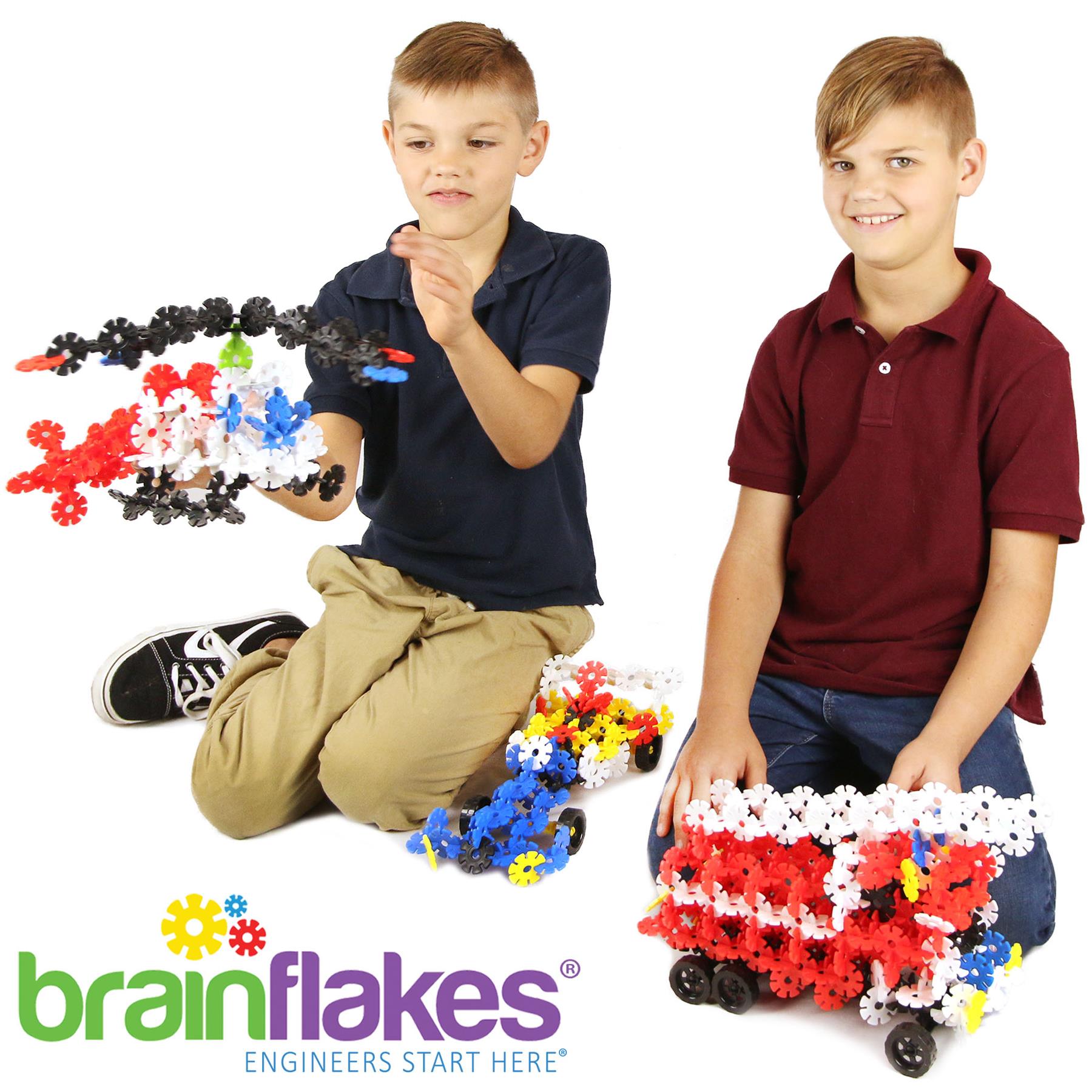 Inside the Braingineer™ 3 in 1 Kit: 580+ pcs including wheels, axles, and rotating connectors for ALL 3 DESIGNS! | Detailed building instructions booklet for the Brain Flakes® Racecar, Helicopter, and Fire Truck